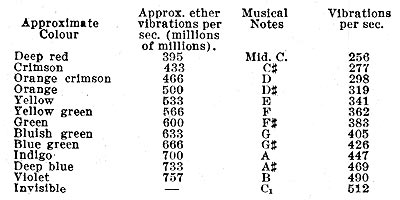 On comparing this with Professor Rimington's table, we find that middle C, raised 41 octaves, will be, not deep red, but yellow (tending slightly toward green) and that A flat below middle C, raised 41 octaves, will be the true "deep red." We may now easily prepare a simple table: